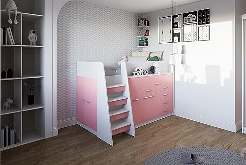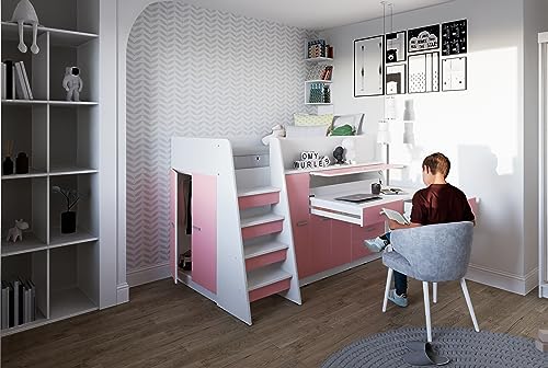 Marlux-Meble Hochbett JSM-1 80×190 TREPPE RECHTS 129 cm Hoch mit Kleiderschrank Schreibtisch Schränke Matt Funktionsbett Etagenbett Stockbett Kinderhochbett Jugendhochbett (Rosa Matt)