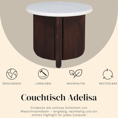 Der runde Couchtisch Adelisa kombiniert massives Mangoholz mit einer eleganten Marmorplatte. Durch seine natürliche Optik und hochwertige Abwicklung wird er zum stilvollen Mittelpunkt in jedem Wohnraum.