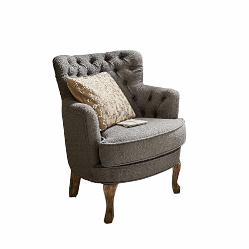 Dimensionen (HxLxB): 102x80x77cm | Material: Bezug: Stoff/Textil (100% Polyester) – Polsterung: Schaumstoff – Rahmengestell: Kiefernholz – Füße: massives Birkenholz | Farbe: Bezug: dunkelgrau – Nieten: silberfarben – Füße: schwarz