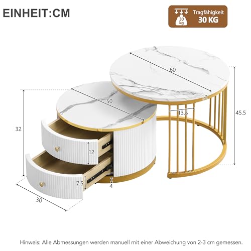 【Exquisites Couchtischset】Dieses raffinierte Couchtisch-Set, das modernes Design mit praktischer Funktionalität verbindet, ist eine stilvolle Nachtrag für jedes Wohnzimmer. Das Set besteht aus zwei runden Tischen in unterschiedlichen Größen: der große Tisch ist 60*60*45.5 cm lang und der kleine Tisch 50*50*32 cm lang. Die Tischplatten beider Tische sind mit einem hochglänzenden Marmormuster beschichtet, das jedem Raum Luxus und zeitlosen Glanz verleiht.