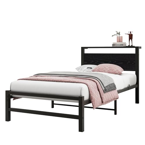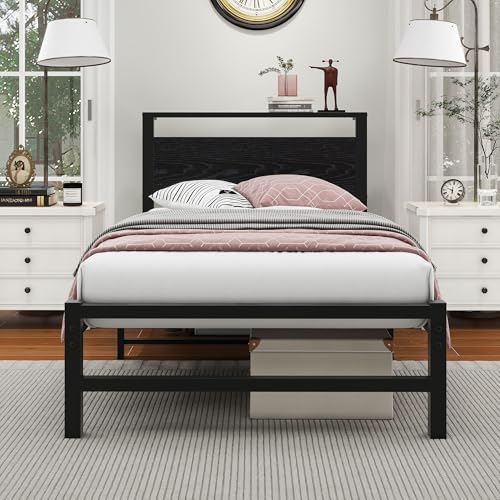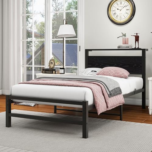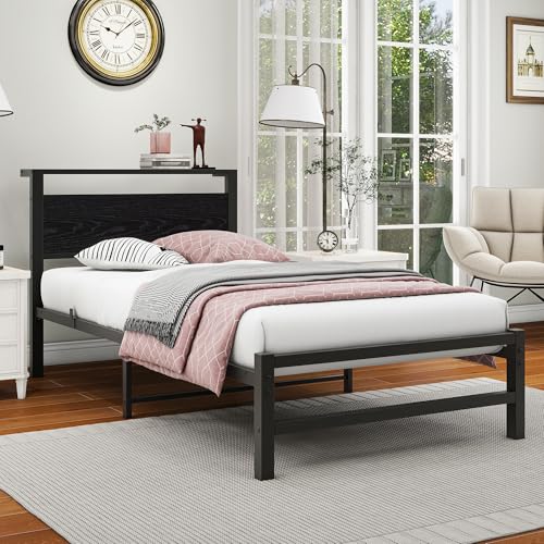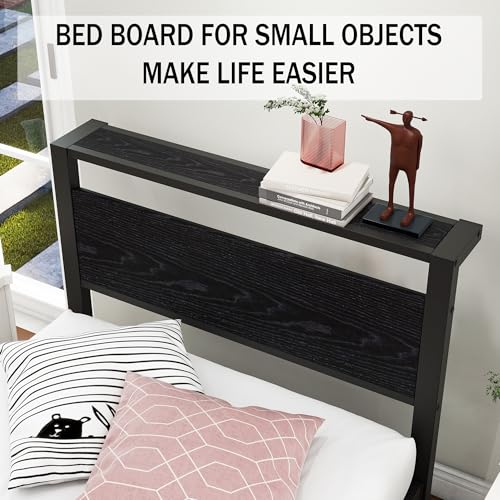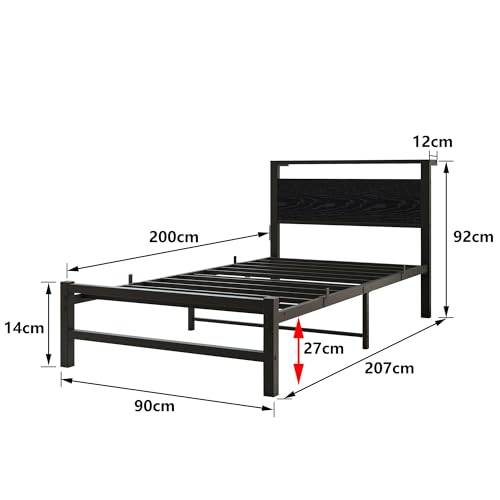 VERFARM Metallbett Bettrahmen mit Holz Lagerung Kopfteil, Bettgestelle mit Lattenrost für Schlafzimmer Gästezimmer, Einfache Montage, Rauschfrei, Schwarz, 90 x 200 cm