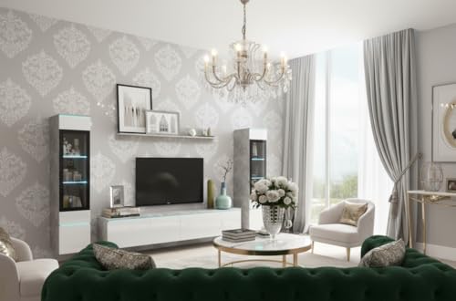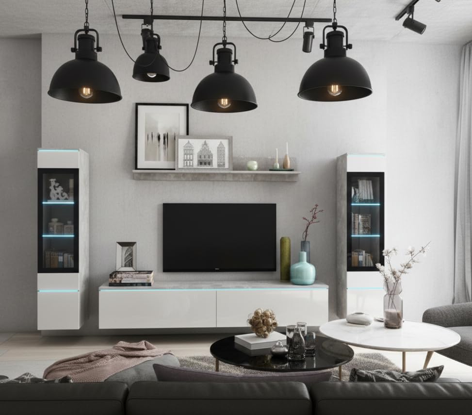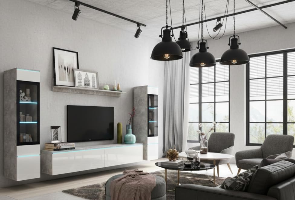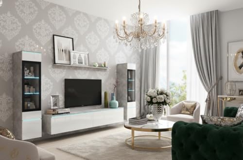 MINIO go for it – Wohnwand 4-Teilig Set Veve 2 I Hängend oder Stehend I 2X Hochschrank-Vitrine I Lowboard I Wandboard I Laminierte Spannplatte I Beton und Weiß Gloss – LED Beleuchtung