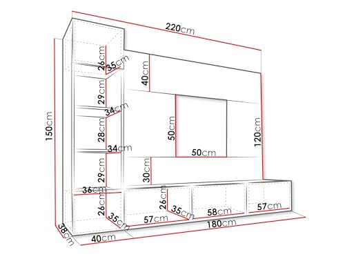 – 1x Hängeregal: Breite: 220 cm, Höhe: 150 cm, Abgrund: 38 cm