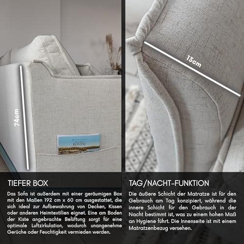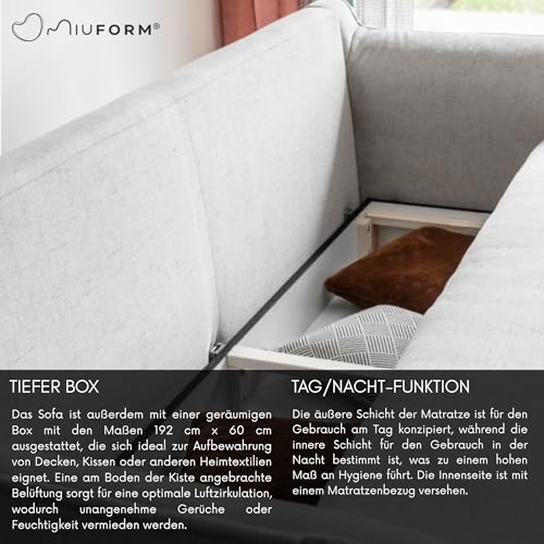 Innovative Schlaffunktion – Das Sofa ist mit einer einzigartigen separaten Matratze ausgestattet, wodurch das Möbelstück zum täglichen Schlafen gut im Rahmen ist. Das Komfort ist dem Schlafen auf einem Bett affin. Zusätzlich kann man die Kissen und die Decken in das Bettkasten, das sich unter dem Sitz befindet, stecken.