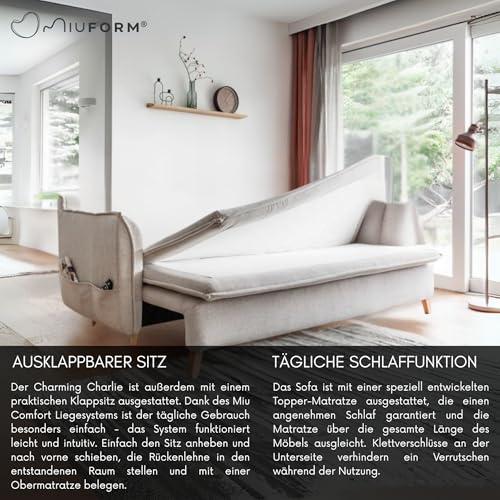 MIUFORM Charming Charlie Slim mit Bettkasten und mit Bettfunktion | 3 Sitzer Sofa | 225 x 90 x 85cm | Klappsofa mit Schlaffunktion | Schlafsofa klappbar (Beige)