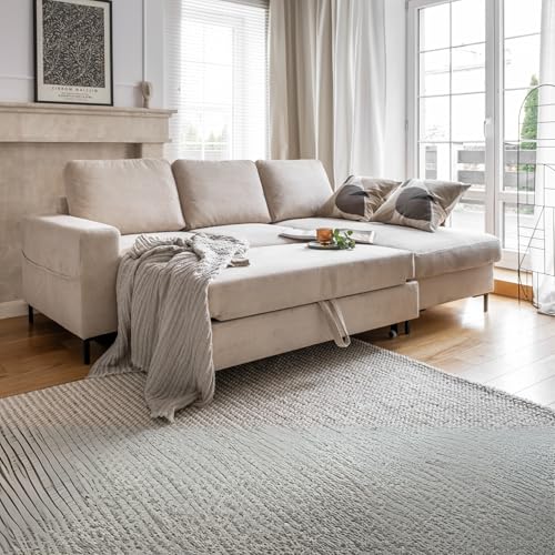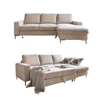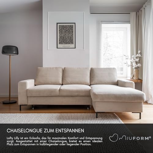 MIUFORM Lofty Lilly mit Bettkasten | 4 Sitzer Ecksofa | L-form rechts | 236 x 148 x 84cm | Klappsofa mit Schlaffunktion | Schlafsofa klappbar (Beige)