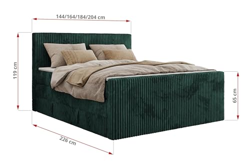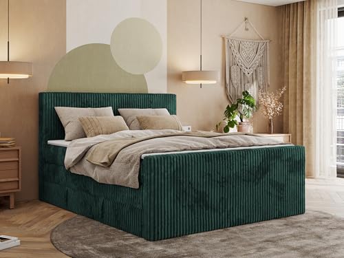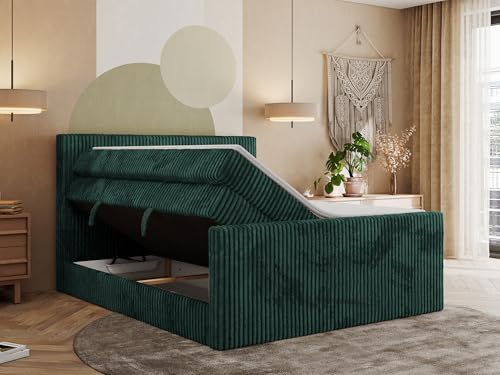 MKS MEBLE Boxspringbett Cord 200×200, Polsterbett Bett Cord, Boxspringbett mit Matratze H4 + Topper T25, Bett mit Bettkasten and Kopfteil, Doppelbett mit Stauraum – Tiliano King Duo – Dunkelgrün Cord