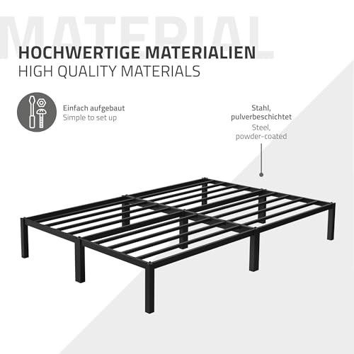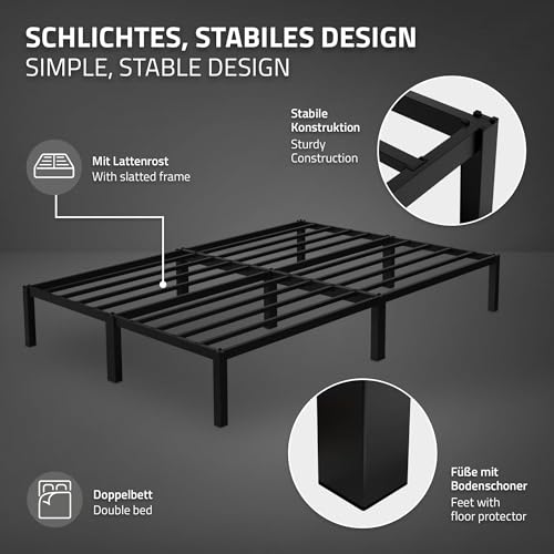 STABILER BETTRAHMEN – Im Gegensatz zu anderen Bettrahmen, die auf separaten Stützfüßen verbunden sind, um das Bett zu verstreben, verwendet dieser Bettrahmen eine Eisenrahmenbasis, um Ihre Matratze bombastisch zu befestigen. Die praktischen Latten bieten die nötige Stabilität und sind sehr komfortabel. Kunststofffußpolster schützen Ihren Boden.