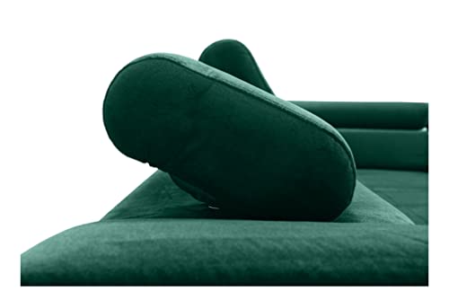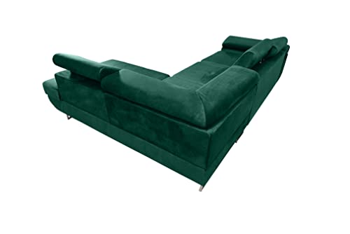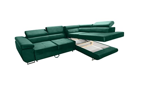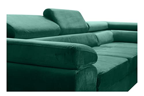 ☁️ Modell AVESTA – dieses geräumige und moderne Ecksofa hat eine sehr bequeme Sitzfläche aus T30-Schaumstoff und gewellten Federn, die mit Veloursstoff bezogen ist. Die Funktionalität wird durch einen sehr praktischen Stauraum, der mit einer Delphin-Automatik geöffnet wird, und bequeme und verstellbare Kopfstützen ergänzt. Das Ecksofa hat geschmackvolle Metallfüße und eine Schlaffunktion mit großer Liegefläche.