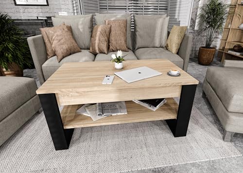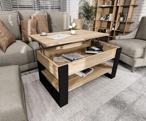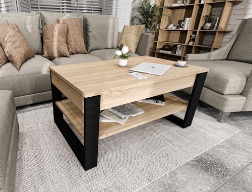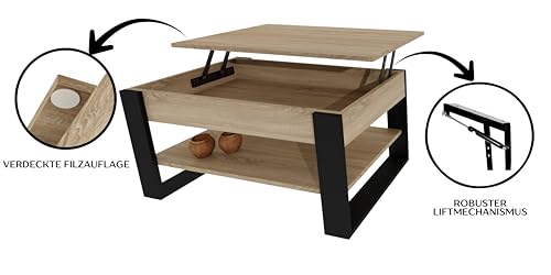 möbelkap Couchtisch mit anhebbarer Platte | Höhenverstellbarer Wohnzimmertisch mit Stauraum | Sofatisch Eiche Sonoma Schwarz modern mit Ablage & verstecktem Fach – Coffee Table für Wohnzimmer & Büro