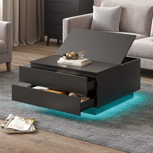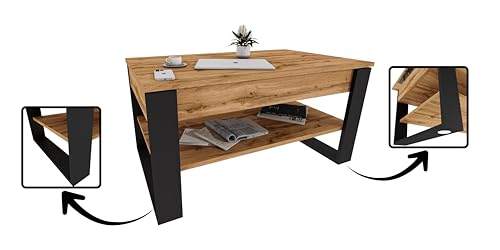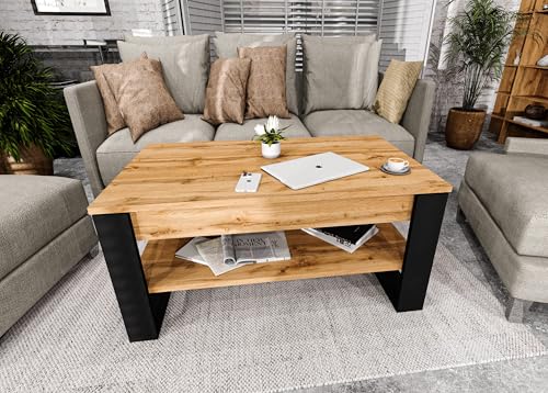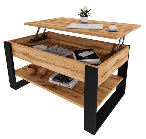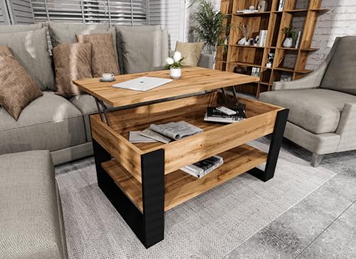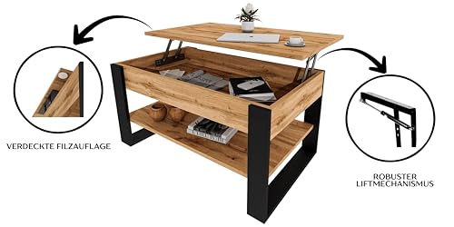 möbelkap Couchtisch mit anhebbarer Platte | Höhenverstellbarer Wohnzimmertisch mit Stauraum | Sofatisch Eiche Wotan Schwarz modern mit Ablage & verstecktem Fach – Coffee Table für Wohnzimmer & Büro
