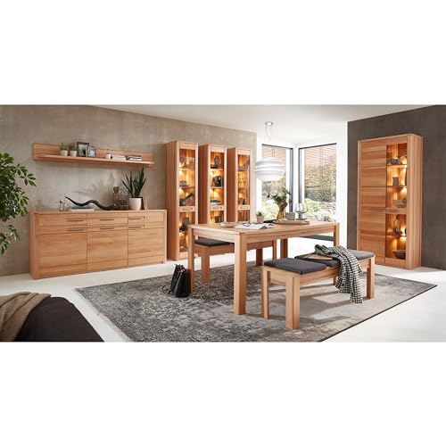 FSC-ZERTIFIZIERT – Die Vitrine steht für nachhaltige Qualität mit einer Front aus massiver Kernbuche und einem Korpus in Kernbuche Optik, die beide FSC-zertifiziert sind. Die Metallgriffe ergänzen das hochwertige Design.