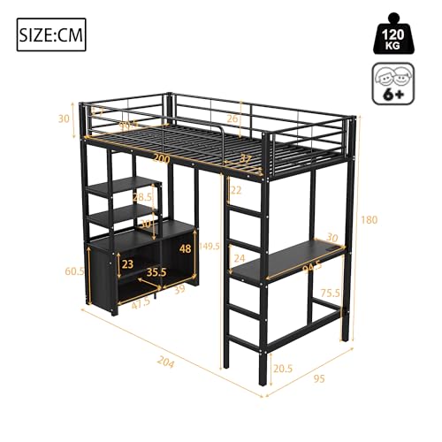 【🛏️Platzsparendes Design】Das Hochbett mit einer Liegefläche von 90 x 200 cm nutzt die Raumhöhe optimal. Dank des integrierten Schreibtischs, der offenen Regale und des geräumigen Lagerschranks wird dieses Funktionsbett zu einem echten Raumwunder.