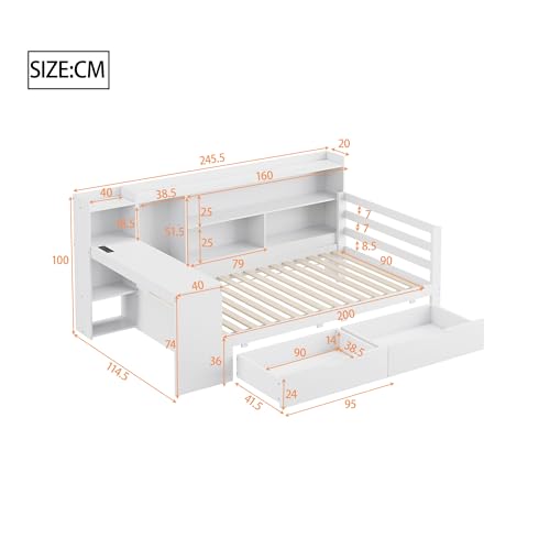 【Multifunktionales Kinderbett】Dieses 90×200 cm große Kinderbett aufgebraucht Kiefernholz ist ideal für Kinder- oder Jugendzimmer. Ausgestattet mit einem integrierten Schreibtisch, einem Bücherregal, einem Regal mit Stauraum sowie mehreren Schubladen, erfüllt es sowohl Schlaf-, Lern- qua aka Aufbewahrungsbedürfnisse.