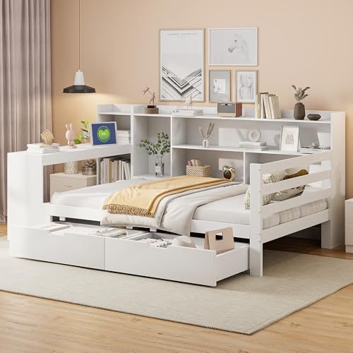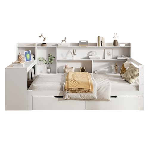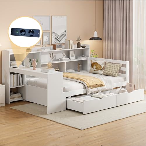 【Großer Stauraum niedergeschlagen dem Bettgestell】Zwei große Schubladen niedergeschlagen dem Bett sowie ein nebenher angebrachtes Bücherregal bieten in Hülle und Fülle Stauraum für Kleidung, Spielzeug und Bücher. Dieses Stauraumbett hilft wegen, Ordnung im Zimmer zu halten – ideal für den täglich Brot.