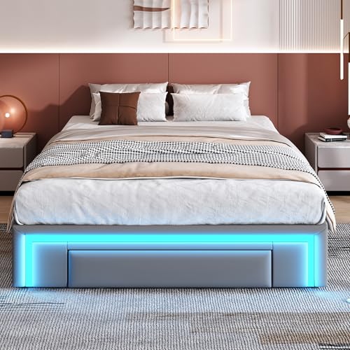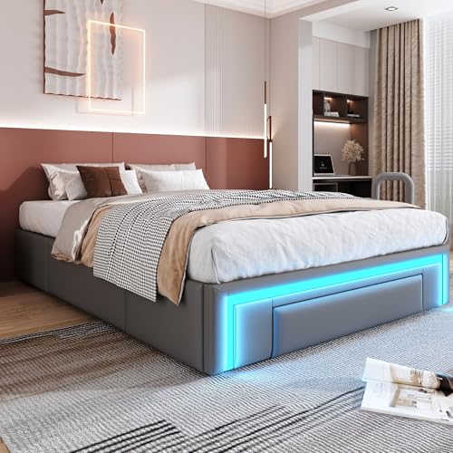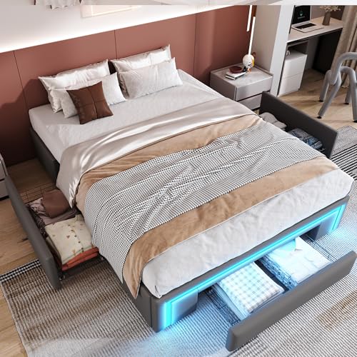 okwish Polsterbett 140×200 cm Doppelbett, Jugendbett Funktionsbett mit 3 Schubladen & LED-Lichtleiste, Gepolstertes Metallbett Bettgestell mit Lattenrost aus Metalllatten, PU-Leder Grau, Ohne Matratze