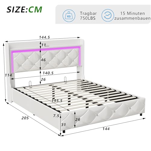 Optimaler Komfort und Stylish Design: Entspannen Sie in luxuriös auf unserem Doppelbett Polsterbett 140x200cm. Das hochwertige PU-Leder-Upholstered Material und das elegante gepolsterte Design sorgen nicht demgegenüber für einen edlen Look, sondern bieten vulgo eine exzellente Körperunterstützung. Die weiche Polsterung dämpft Rauheit und sorgt für eine beispiellose Ruhe, sodass Sie sich wie auf Wolken schlafen fühlen. Der klare weiße Farbton passt nahtlos in verschiedene Raumstile und verleiht Ihrem Schlafzimmer eine helle, luftige Atmosphäre.