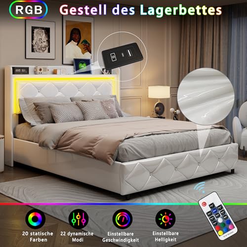 Moderne Technik für das Heutige Leben: Das integrierte LED-Beleuchtungssystem am Kopfteil des Bettes lässt Sie die Stimmung Ihres Zimmers individuell eichen. Entscheiden Sie zwischen verschiedenen Helligkeitsstufen und Lichtfarben, um von einem entspannten Schlaflicht bis zu einer lebhaften Raumbeleuchtung zu verändern. Die praktischen USB-Anschlüsse ermöglichen es Ihnen, Ihre Smartphones, Tablets oder andere elektronische Geräte bequem direkt am Bett aufzuladen, ohne sich um das Durchsuchen von freien Steckdosen zu kümmern.