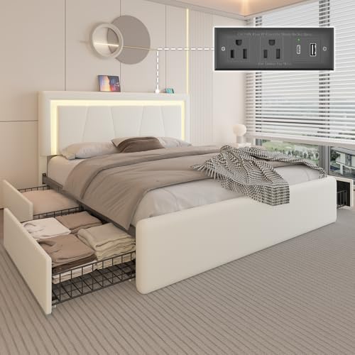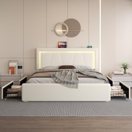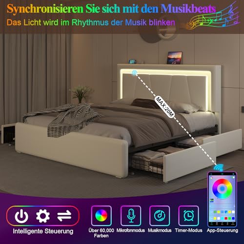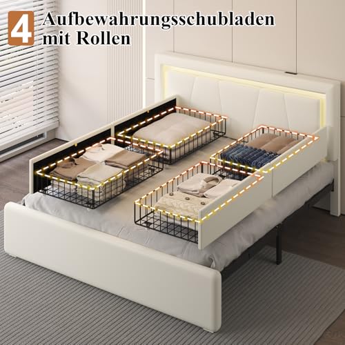 【4 ausziehbare Schubladen】Dieses Bettgestell mit LED-Beleuchtung verfügt über 4 geräumige Schubladen unter dem Bett. Jede Schublade ist mit 4 leichtgängigen Rollen ausgestattet und lässt sich mühelos herausziehen und herleiten. In diesen Schubladen können Sie saisonale Kleidung oder andere Gegenstände verstauen und so für Ordnung und Übersichtlichkeit in Ihrem Schlafzimmer sorgen