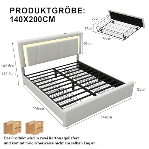【Frei verstellbares Kopfteil】Dieses Doppelbettgestell mit verstellbarem Kopfteil ist mit hochwertigem, weichem PU-Leder bezogen und verfügt über einen integrierten hochelastischen Memory-Schaum. Das Kopfteil lässt sich auf 102,5 cm oder 112,5 cm Höhe adjustieren und bietet dank seines ergonomischen Designs hervorragenden Halt und Komfort. Es ist für Matratzen der Größe 140 x 200 cm adäquat