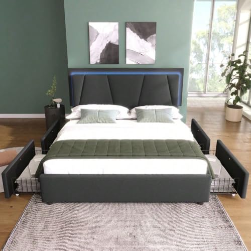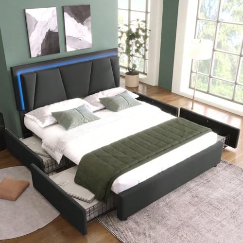 Speicherdesign: Das Bett ist mit 4 Schubladen mit großem Fassungsvermögen ausgestattet. Zwei Seiten des Bettes sind mit Schubladenschnallen ausgestattet, die es ermöglichen, die Schublade fest am Bett zu unterstützen, wenn die Schublade nicht verwendet wird, damit Ihr Schlafzimmer aufgeräumt wird. Die Aufbewahrungsboxen lassen sich dank der Rollen am Boden leicht aus- und einrollen.