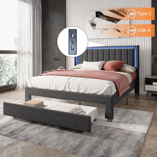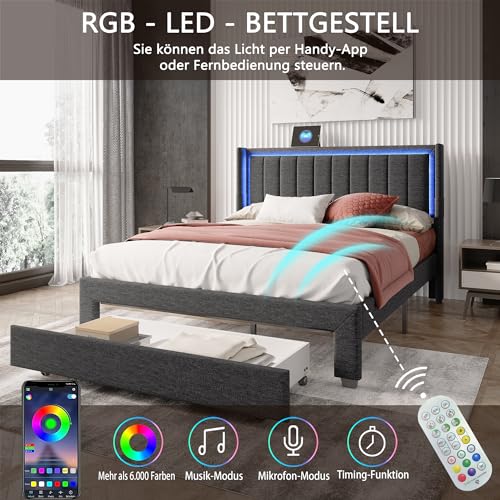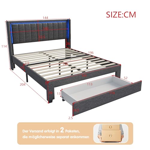 Polsterbett 140×200 cm mit Schubladen, Doppelbett mit Stauraum, Funktionsbett mit LED und USB Ladefunktion, Jugendbett Stauraumbett Bettgestell mit Holz Lattenrost, Leinen, Grau, Ohne Matratze