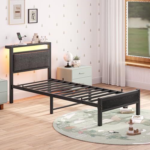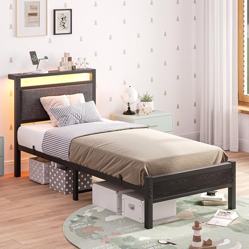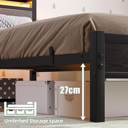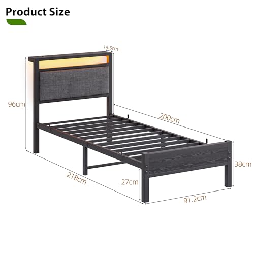 Polsterbett Bettgestell 90x200cm, Bettrahmen mit LED und Ladestation, Metallbett mit Kopfteil,Modern Gästebett Jugendbett Bettrahmen,Bett 90x200cm mit Lattenrost für Schlafzimmer, Schwarz