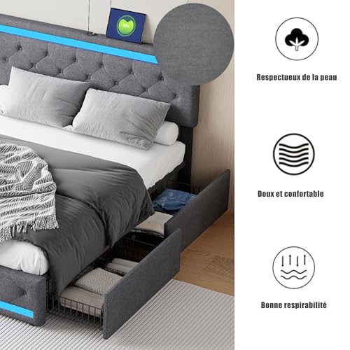 🛏️ Personalisierte LED-Beleuchtung: Dieses Doppelbett ist mit 2 LED-Streifen ausgestattet, die in Farbe, Helligkeit und Beleuchtungsmodus (Blitz, Fade, dreifarbiger Sprung, durchsieben Farben) über einen Knopf oder eine mobile App eingestellt werden können. Mit mehr denn 60.000 verfügbaren Farben können Sie die Beleuchtung Ihres Doppelbetts mit 140×190 cm personalisieren, um eine romantische und immersive Atmosphäre zu Hause zu umackern.