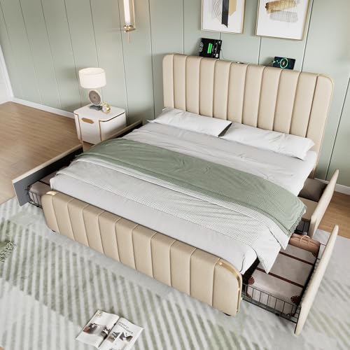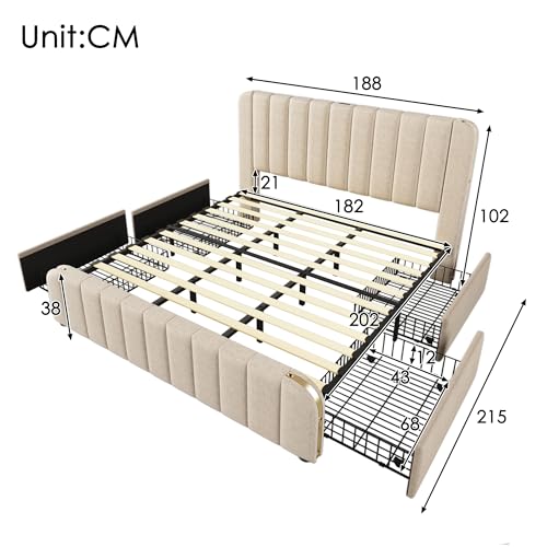Praktisches Stauraumdesign: Das Bett verfügt über 4 großzügige Schubladen. An den Seiten befinden sich Schubladenschnallen, die es ermöglichen, die Schubladen fest am Bett zu abstützen, wenn sie nicht in Gebrauch sind, um Ihr Schlafzimmer adrett zu halten. Dank der Rollen lassen sich die Schubladen leicht heraus- und hereinschieben. Der 20 cm hohe Stauraum unter dem Bett erleichtert zudem die Reinigung.