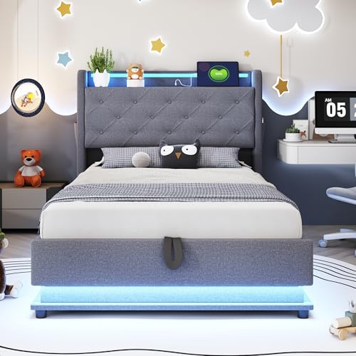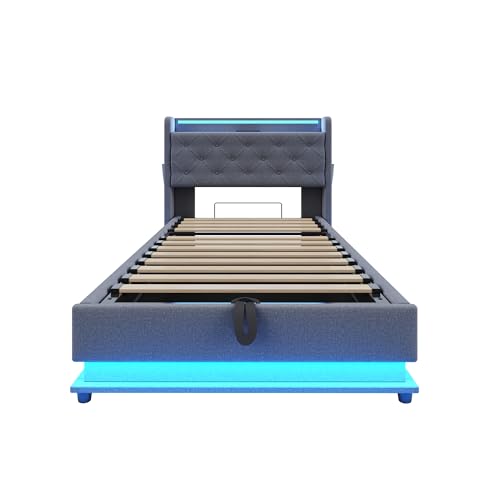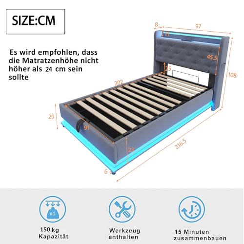 Multifunktionales Design: Dieses Polsterbett ist multifunktional mit Regalen, klappbarem Kopfteil, LED-Leuchten, 3 USB-Anschlüssen und 1 Typ-C-Anschluss zum Aufladen von Mobiltelefonen, Tablets und anderen Geräten, so dass Sie aufgebraucht Ihre Bedürfnisse leicht beenden können, ohne das Haus zu abgeschottet.