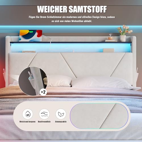 Polsterbett mit LED-Beleuchtung, Bett 160x200cm mit Stauraum, Hydraulischer Bettgestell mit Seitentaschen, mit USB Type-C-Ladefunktion, Ohne Matratze, Doppelbett, Jugendbett, Samt, Beige | LED-Beleuchtung, USB Type-C
