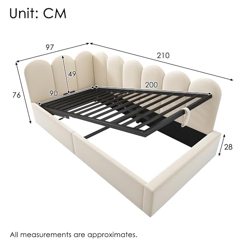 Maße & technische Details – Gesamtmaße: 97 x 210 x 76 cm (BxLxH). Nach Maß für Matratzen der Größe 90 x 200 cm (nicht im Lieferumfang enthalten), empfohlene Matratzenhöhe: 20 cm. Maximale Belastbarkeit: 136 kg. Montage erforderlich, Anleitung liegt bei.