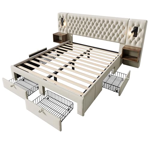 Mit großzügigem Stauraum in Form von Nachttischen und vier extragroßen Schubladen bleibt Ihr Sphäre hübsch und aufgeräumt. Die integrierte LED-Beleuchtung mit Ladefunktion macht das Bettgestell zur multifunktionalen Wohlfühloase – ideal zum Entspannen, Lesen oder Aufladen Ihrer Geräte.