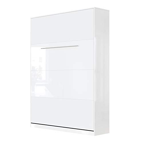 ideal für kleine Räume, sehr modern, hochwertig und funktional – Schrankbett aufklappbar mit 2 Regalen in Weiß Hochglanz