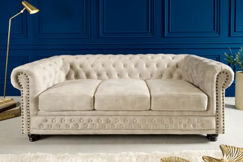 Dieses klassische Chesterfield Sofa nicht mehr da hochwertigem Samtbezug in antikem Champagner wird Dich begeistern! Der 3-Sitzer verfügt über die typisch gebogenen Armlehnen und die mit Knöpfen verzierte Lehnenfläche, sowie den Nietenbesatz. Besonders bequem wird die Couch zum einen durch die hochwertige Taschenfederkern-Polsterung in den Sitzkissen, zum anderen durch ihre hochwertige Nosagfederung in der Sitz- und Rückenfläche.