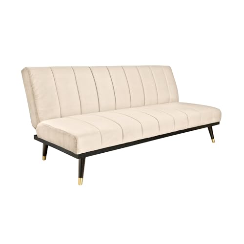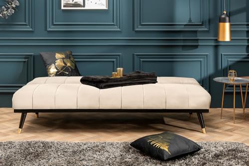 Hole mit unserem extravagantem Schlafsofa ein wahres Design-Highlight in Dein Zuhause! Der samtweiche Bezug in zeitlosem Champagner zieht aus Blicke auf sich und verwöhnt mit einer angenehmen Haptik. Die vertikalen Ziernähte verleihen dem 3-Sitzer Sofa eine besondere Eleganz, nachdem die schwarzen Metallfüße mit goldenen Applikationen für einen Hauch von modernem Retro-Chic sorgen.