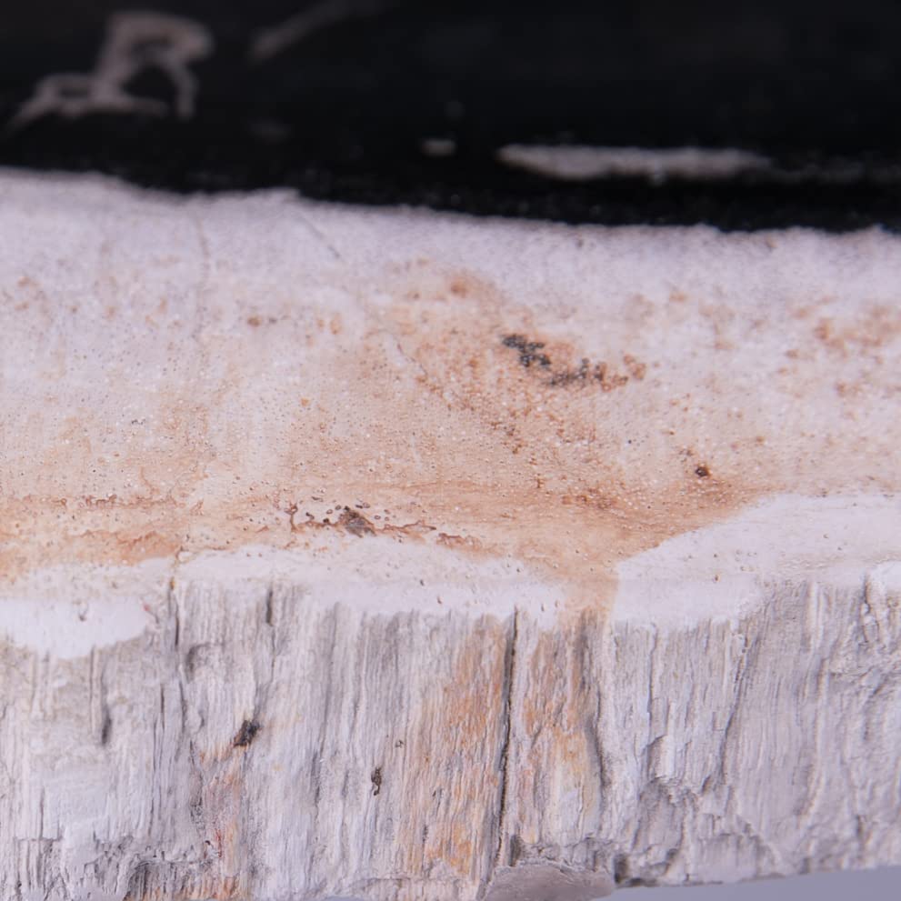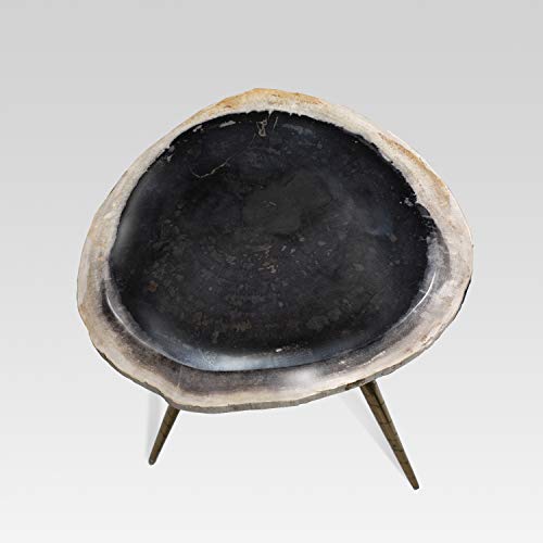 UNIKAT: Einmalig ist die versteinerte Tischplatte, die selbst Jahrtausende nach ihrer Anfall aufgrund der Tatsache den Verlauf der Verkieselung empfangen geblieben ist. Ihre asymmetrische Form sowie die raue Kante kontrastieren unter Zuhilfenahme von den Tischbeinen, die dem Objekt einen Eindruck der Leichtigkeit verleihen und unter Zuhilfenahme von dezenten schwarzen Gravuren versehen sind.