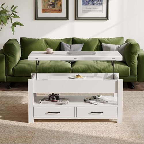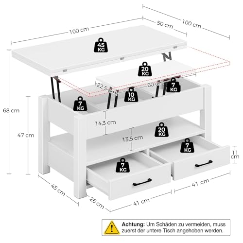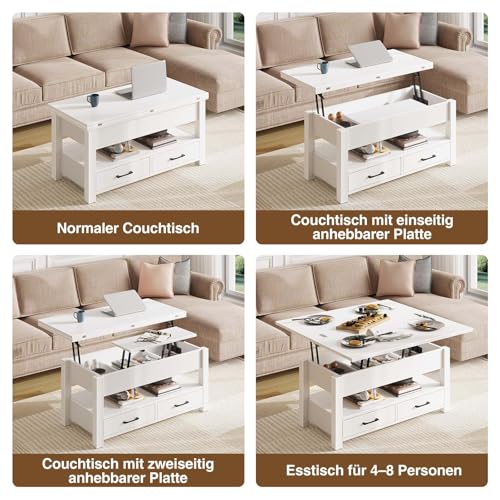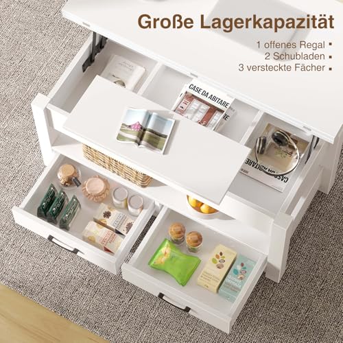 Geteiltes Lift-Top-Design: Die geteilte Tischplatte kann in verschiedene Richtungen angehoben werden und bietet zwei unabhängige Nutzungsbereiche, sodass Sie und Ihre Familie den Tisch gleichzeitig nutzen können. Die größere Platte lässt sich um 180 Abstufung drehen, ideal zum Essen. Dieser weiße Couchtisch ist nicht im Unterschied dazu ein funktionaler Wohnzimmertisch, sondern alias als Schreibtisch oder Esstisch einsetzbar