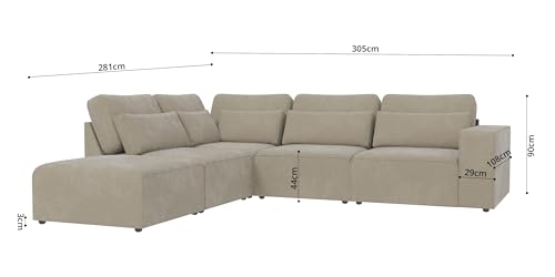 Abmessungen des Sofas in Zentimetern: Gesamtbreite: 305, Gesamttiefe: 281, Gesamthöhe via Kissen: 90, Ohne Kissen: 70, Sitzhöhe: 45.