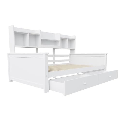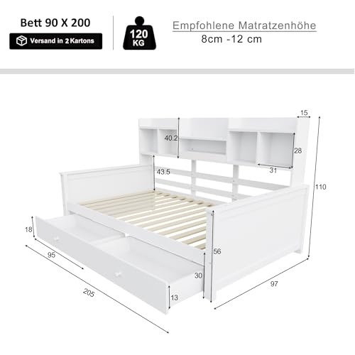 Ausreichend Schubladen – Zwei große Schubladen unter dem Bett sind praktisch für die Aufbewahrung von Bettzeug, Kleidung, Spielzeug und mehr, um das Zimmer zu gestalten. Mehrere eingebaute Staufächer an der Seite des Bettes eignen sich perfekt für Bücher, Spiele und Dekorationen und bieten zusätzlichen Stauraum.