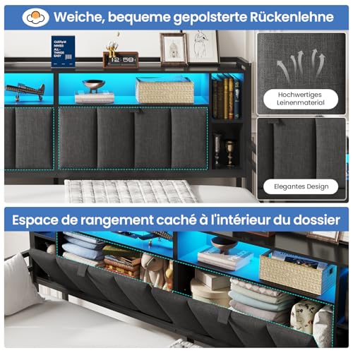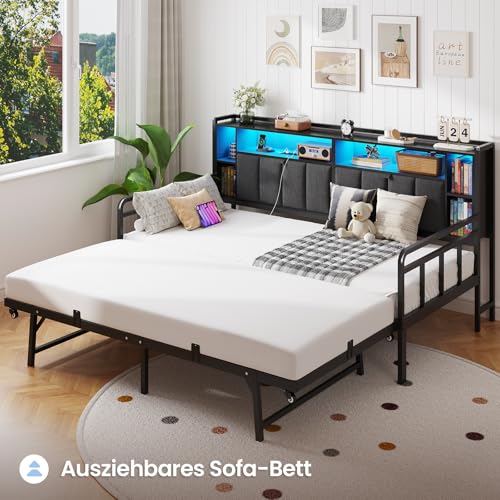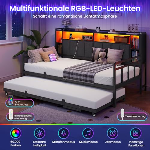 【RGB LED-Beleuchtung für eine romantische Atmosphäre】Das Sofabett ist mit einer RGB LED-Lichtleiste ausgestattet. Per App, Schalter oder Fernbedienung können Sie die Farben(über 60.000 Lichtfarben), Helligkeit, den Musikmodus, Mikrofonmodus und die Timing-Foto einstellen. Im Musikmodus verändert sich die Lichtfarbe mit der Musik. Egal, ob Sie vor dem Schlafengehen eine romantische Stimmung schaffen oder bei einer Party eine bessere Atmosphäre mit Musik erzielen möchten, die LED-Beleuchtung kann Ihnen dabei helfen. Die Lichtleiste mit mehreren Modi ermöglicht es Ihnen, dem Schlaf-, Wohn- und Arbeitszimmer eine persönliche Note zu verleihen und ist deswegen sehr beliebt bei jungen Leuten