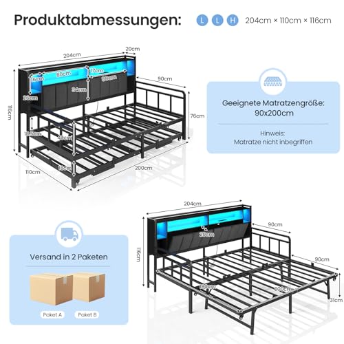 【Solider Metallrahmen für lange Lebensdauer】Das ausziebare Bett ist aus hochwertigem Metall gefertigt, wobei besonderer Wert auf Stabilität und Langlebigkeit vom Rahmen und Lattenrost gelegt wurde: 1. die Verbindungsstellen sind fest und gefestigt, auch bei längerem Gebrauch lösen sie sich nicht; 2. die Metalllatten sind gleichmäßig verteilt, haben einen angemessenen Abstand zueinander und bieten ausreichende Stütze für Matratze, sodass sie nicht durchhängt und gleichzeitig luftdurchlässig ist. 3. Mit einer hohen Belastbarkeit von bis zu 400 kg wackelt oder quietscht das Jugendbett nicht, selbst wenn zwei Personen gleichzeitig darauf abbrummen oder liegen.