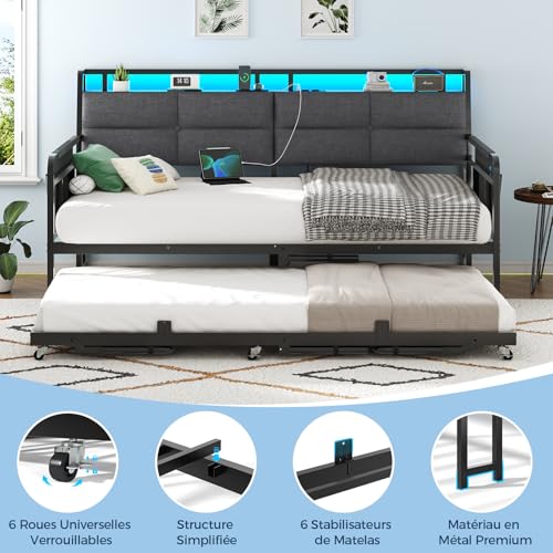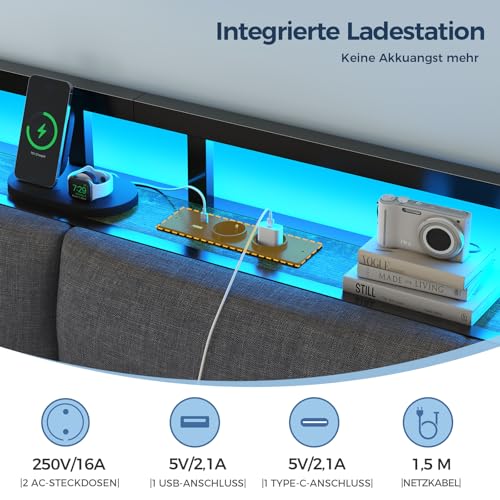 【Ladestation, ohne Akkuangst】Die im Kopfteil integrierte Ladestation verfügt über 2 AC-Steckdosen (250/16A), 1 USB- und 1 Type-C-Anschluss. Die Ladebuchsen in 3 Arrangieren bieten eine effiziente Stromzufuhr für verschiedene Geräte, so können Sie Handy, Tablet und andere elektrische Geräte bequem aufladen, ohne mühsam nach einer Steckdose grasen zu müssen. Verabschieden Sie sich von Akkuangst und genießen Sie entspannte Stunden mit Ihren elektronischen Geräten in diesem Tagesbett mit Steckdosen.