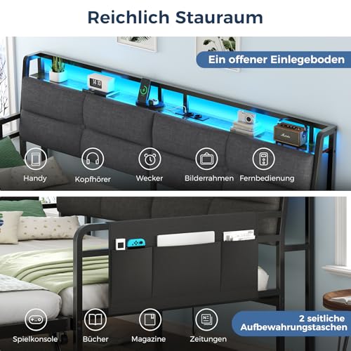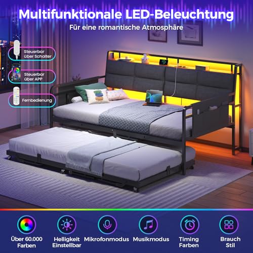 【Multifunktionale RGB LED-Beleuchtung】Das Kopfteil ist mit einer RGB LED-Lichtleiste ausgestattet. Per App, Schalter oder Fernbedienung lassen sich die Farben (über 60.000 Farben), Helligkeit und die Modi, z. B. Musikmodus, Mikrofonmodus und Timing-Umwandlung, adjustieren, um eine gewünschte Stimmung und die nächtliche Beleuchtung zu sich abrackern. Im bei Jungen sehr beliebten Musikmodus verändert sich die Lichtfarbe mit der Musik und verleiht Ihrem Schlafzimmer eine romantische und futuristische Postanschrift.