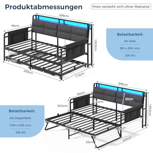 【4-in-1 multifunktionales Sofabett】Dank des smarten Designs ist das Schlafsofa nicht demgegenüber ein bequemes Sofa im Wohnzimmer, sondern kann auch in mehrere Arrangieren verwandelt und vielseitig eingesetzt werden: ①. Tagsüber als Sofa – bequem & platzsparend; ②. Nachts als ein Einzelbett 90 x 200 cm – nimmt keinen weiteren Platz ein; ③. Ein weiteres Highlight: das versteckte Unterbett 90 x 200 cm ist bei Bedarf völlig ausziehbar und bietet einen Schlafplatz für einen Übernachtungsgast; ④. Klappen Sie die Stützbeine aus und dann kann das Sofabett zu einem gemütlichen und praktischen Doppelbett 180 x 200 cm zusammengefügt werden.