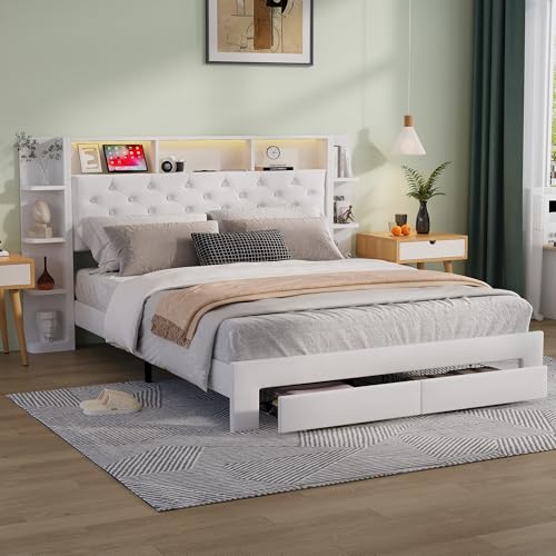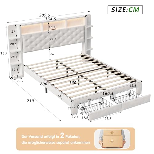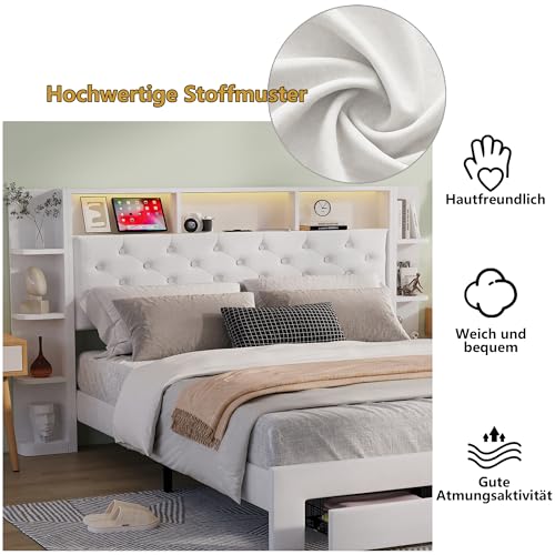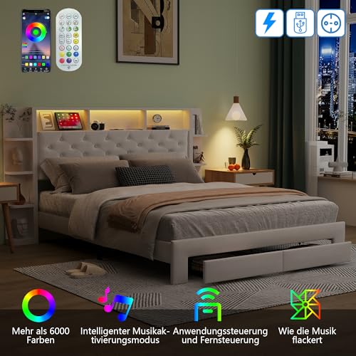 Extras: 2 Schubladen, Regal-Kopfteil, LED-Beleuchtung mit Fernbedienung & App, USB-Ladeanschluss