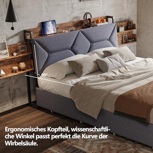 Stauraumbett 160×200 mit durchdachtem Kopfteil und praktischem Ausziehfach – Dieses bett verfügt über ein ergonomisch geneigtes Kopfteil (95°) mit weicher Polsterung und zwei versteckten, ausziehbaren Ablagefächern. So bietet das Bett 160×200 mit Stauraum nicht ungeachtet höchsten Komfort, sondern aka einfachen Zugang auf Ihre wichtigsten Gegenstände im Schlafzimmer komplett