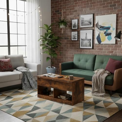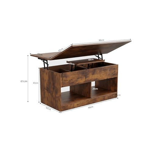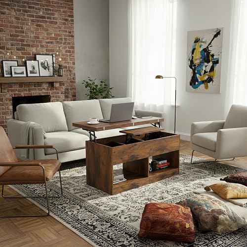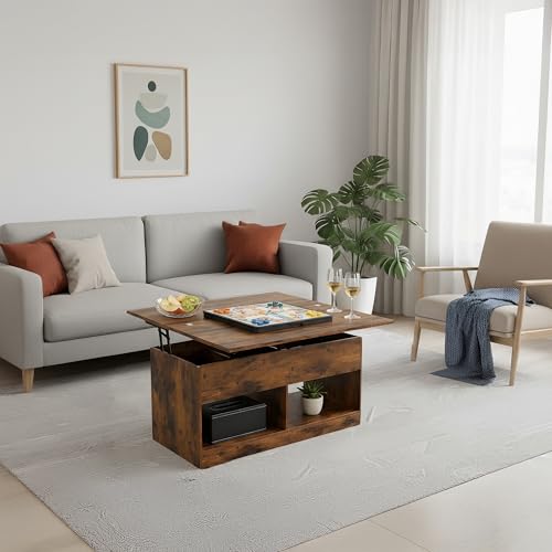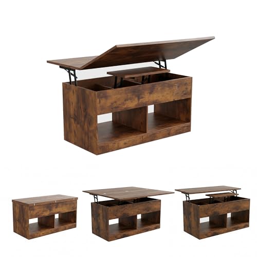 SHOWHA Couchtisch,höhenverstellbarer Wohnzimmertisch,Hebeplatte Kaffeetisch,2 Offenes Fach und Versteckter Aufbewahrung,Rechteckiger Beistelltisch Sofatisch,Kann in Esstisch Umgewandelt Werden,Vintage
