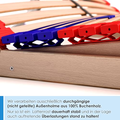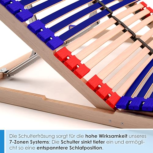 MADE IN GERMANY: die Gesamtheit 100% Buchenholz (beträchtlich langlebiger und formstabiler wie Birkenholz!), 7-Zonen System mit Schulterfräsung, 42 Federholzleisten, reißfester Mittelgurt