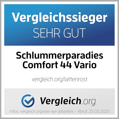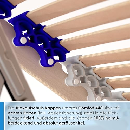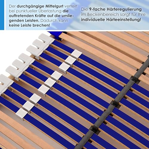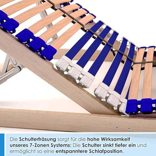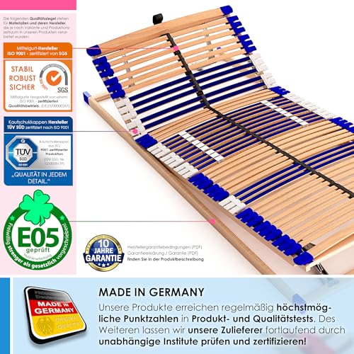 MADE IN GERMANY: leer 100% Buchenholz, 7 Zonen System unter Zuhilfenahme von Schulterfräsung, 44 Federholzleisten, reißfester Mittelgurt, 9-fache Härteregulierung, Kopf- und Fußteilverstellung